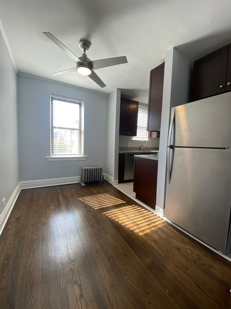 Welcome to this oversized studio in a prime Chicago location, offering the perfect blend of space, style, and convenience. Inside, you’ll find modern finishes throughout, including quartz countertops, stainless steel appliances, and hardwood floors that give the space a clean, elevated feel. The open layout provides plenty of room to live, work, and relax comfortably. The building is equipped with a secure intercom system and 24-hour video surveillance for added peace of mind. Enjoy access to on-site laundry, a spacious gated yard, and pet-friendly amenities including on-site waste stations. Additional storage is included at no extra cost, making it easy to keep your space organized. Don’t miss out on this well-appointed, secure studio in an unbeatable location!